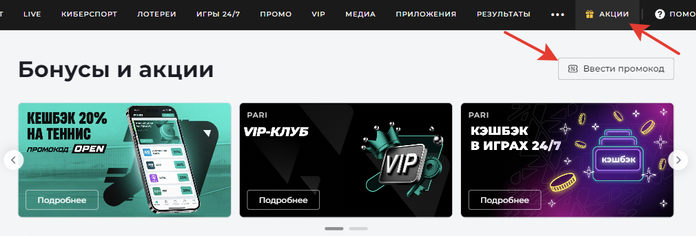 ✨ Промокод на фрибет. Этот вариант подразумевает введение специального промокода. Ввести его можно на сайте «Пари» после авторизации в разделе «Акции».
