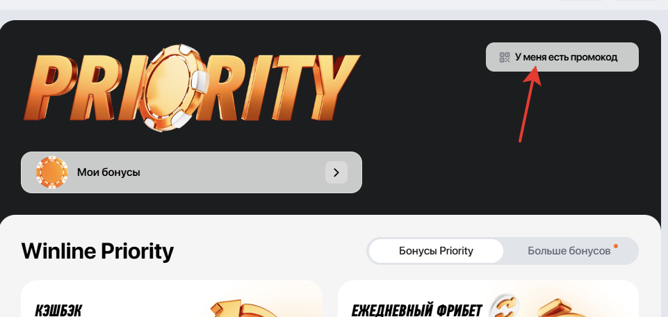 Действующие игроки могут ввести промокод из меню пользователя «Winline Priority» по кнопке «У меня есть промокод».