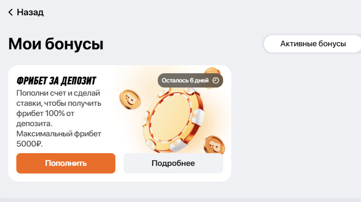 Игроки, которые долго не проявляли активность, тоже могут получить дополнительный бонус, причем необязательно связанный с промокодом. Так букмекер стимулирует клиентов вернуться к игре. Вот пример такого бонуса на депозит.