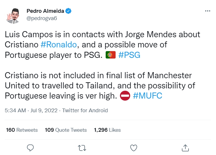 Как информируют многие СМИ, Роналду хочет продолжить выступать в Лиге чемпионов, так как его карьера близка к финишу. Португалец не планирует жертвовать сезоном, выступая в Лиге Европы в составе «Манчестер Юнайтед».