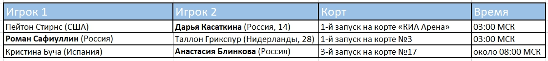 Дарью Касаткину на старте соревнований ждёт далеко не самая сильная американка Пейтон Стирнс. Ещё одна российская теннисистка Анна Блинкова померится силами с испанкой Кристиной Бучей. Наконец, в мужском одиночном разряде классно начавшего сезон Романа Сафиуллина ждёт бой с 28-м номером посева, голландцем Таллоном Грикспуром.