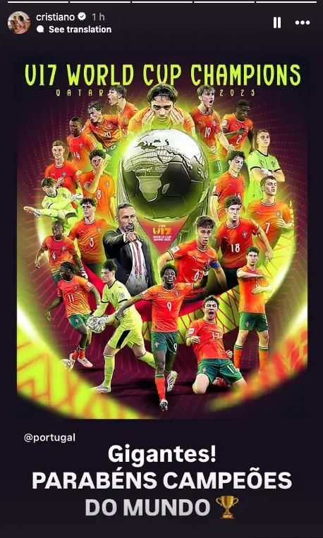 В четверг в Катаре сборная Португалии впервые в своей истории выиграла Чемпионат мира среди игроков до 17 лет, одержав победу над Австрией со счетом 1:0. Криштиану Роналду, которого называют величайшим португальским футболистом всех времен, одним из первых поздравил команду. Он отправил простое, но эффектное послание своей многомиллионной аудитории в социальной сети.
