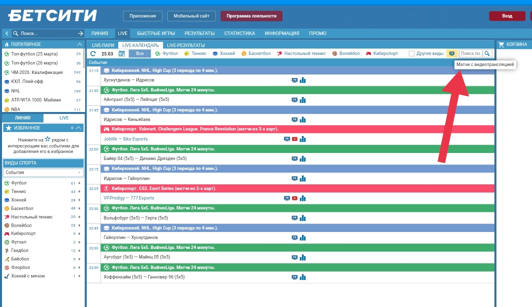Кроме того, в «Бетсити» для просмотра необходим положительный баланс счета. Из плюсов можно разве что отметить удобный фильтр, отображающий текущие и предстоящие события с трансляциями.