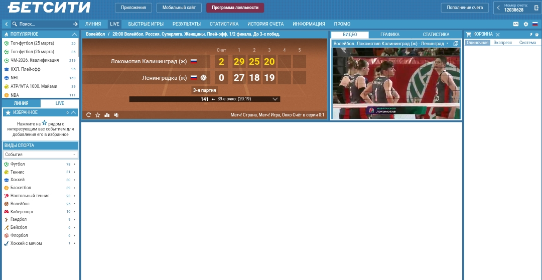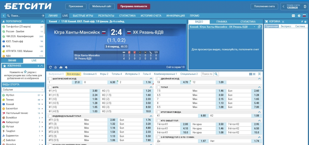 Трансляции доступны только зарегистрированным клиентам «Бетсити». Баланс при этом должен быть положительным, поэтому для просмотра потребуется пополнить счет. Минимальная сумма в «Бетсити» составляет 100 рублей.