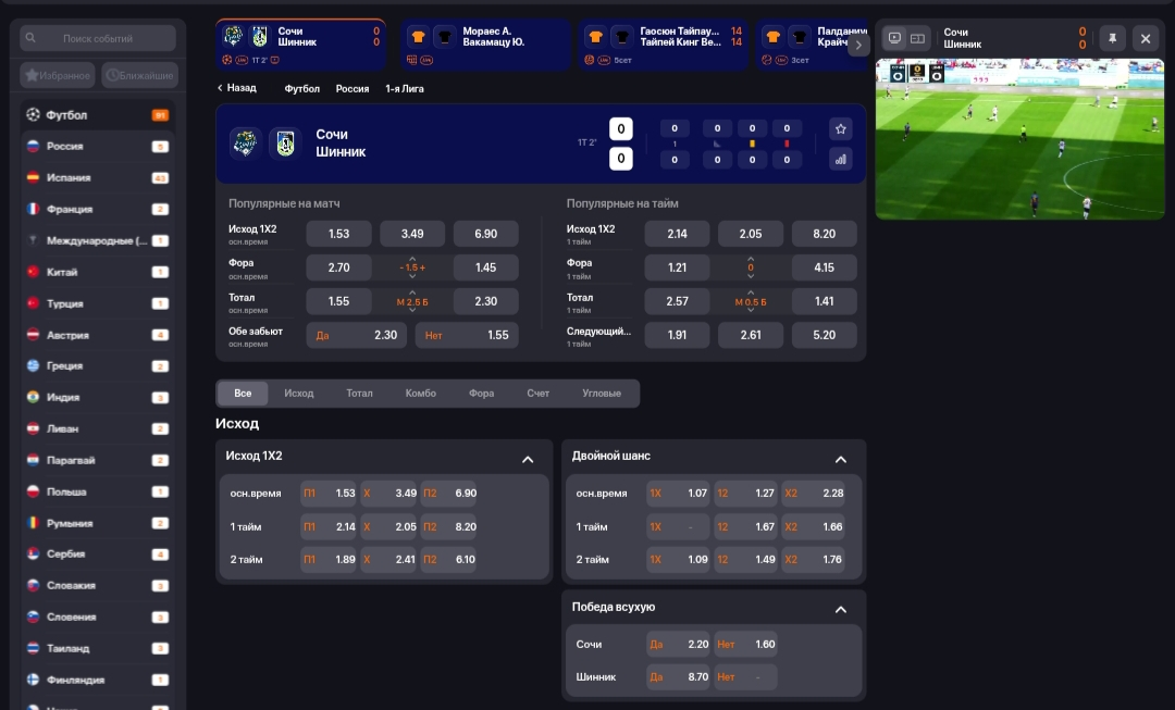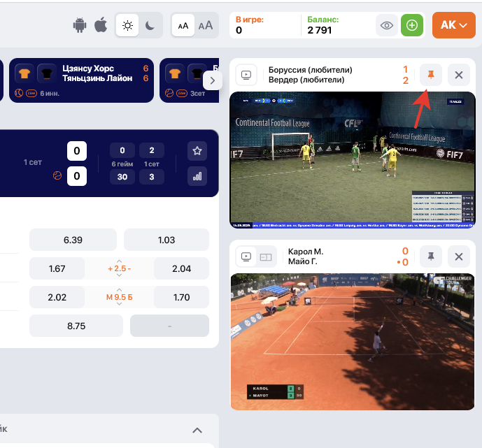 Матчи транслируются в компактном и полноэкранном формате на всех платформах букмекера. На ПК-версии сайта при просмотре в компактном режиме видео фиксируется в правом сайдбаре и остается на глазах даже при переходах в другие разделы сайта, за исключением страниц других матчей.