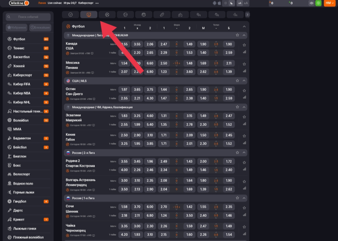 У «Винлайн» есть фильтр, показывающий события с трансляциями. На мобильной версии сайта и в приложении он действует только для live-режима, но на основном сайте букмекера работает и для прематча.