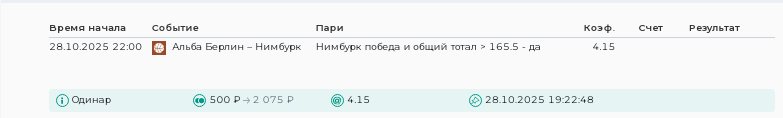 Второй победит и тотал > (165.5) - Да. с ОТСтавка: 500Проигрыш: -500