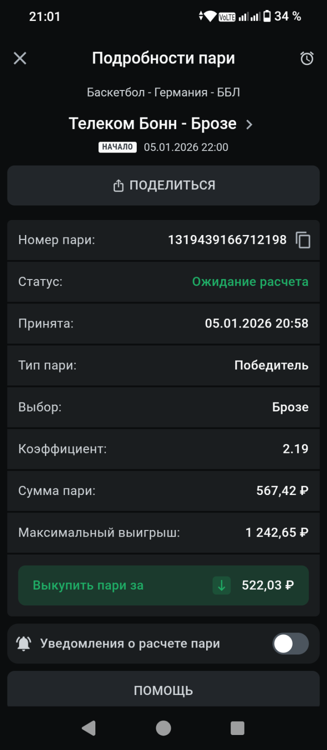 Победа в матче 2. с ОТСтавка: 500Проигрыш: -500 Результат: 76:74 (21:22 15:14 19:23 21:15)