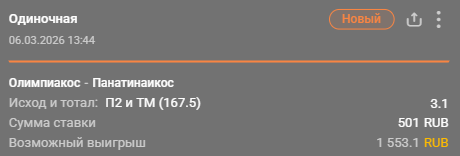 💡 Победа «Панатинаикоса» + тотал меньше (168.5) за 3.50