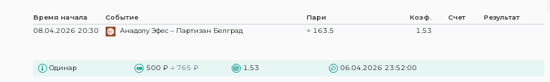 Тотал (157.5) Б. с ОТСтавка: 500Проигрыш: -500 Результат: 79:72 (15:13 9:23 19:14 22:15 14:7)
