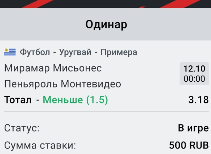 Тотал (1.5) МСтавка: 500Проигрыш: -500 Результат: 2:2 (2:0 0:2)