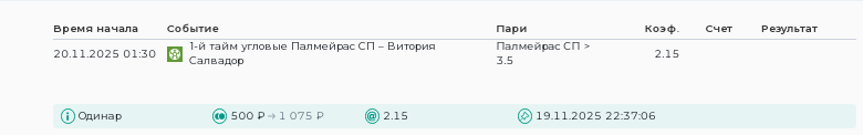 💡 Так что и в этой встрече жду мощного старта в исполнении Палмейраса, благодаря которому они запрут соперника в его штрафной. При таких раскладах 3 и более угловых в исполнении хозяев - это вопрос времени.