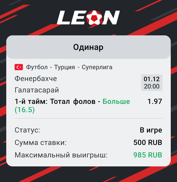 💡 Поэтому есть определенные ощущения, что сегодня все закипит на Шюкрю Сараджоглу уже с первых минут матча. Отсюда предлагаю вариант с 17-ю и более нарушениями правил в первом тайме этого дерби.
