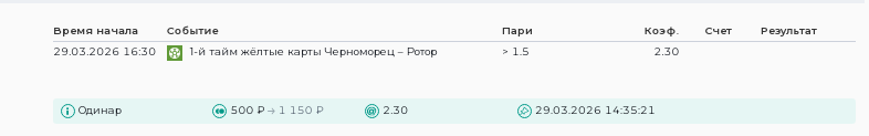 В таком случае предлагаю обратить внимание на желтые карточки, так как Ротор идет в лидирующей группе чемпионата по получаемым жк - 2.2 за матч, но и Черноморец отстал не так далеко со своими 1.9 жк. Учитывая, что обе команды получают по 2 жк за матч, то по 1 из них мы вполне можем увидеть сегодня уже до перерыва, тем более, статистика к этому располагает.