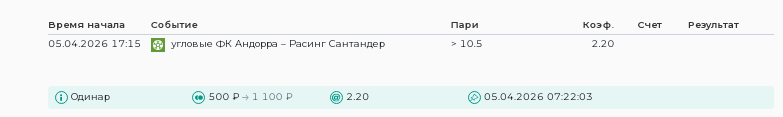 Угловые. Тотал (10) БСтавка: 500Проигрыш: -500 Результат: 6:2 (2:2 4:0)
