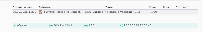 Индивидуальный тотал 1 Больше (17.5). 1-й ТаймСтавка: 100Выигрыш: +90