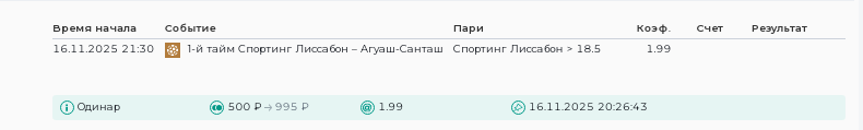 Индивидуальный тотал 1 Больше (18). 1-й ТаймСтавка: 100Проигрыш: -100