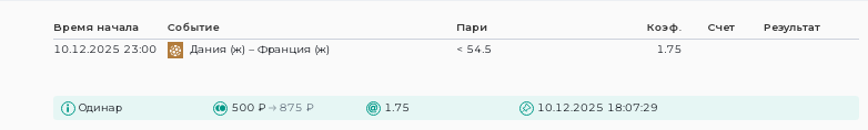 Тотал (54.5) МСтавка: 500Проигрыш: -500 Результат: 26:31 (12:17 14:14)