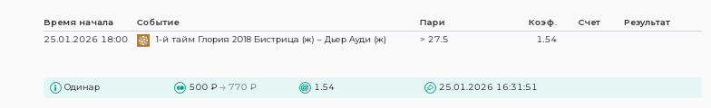 Тотал (27.5) Б. 1-й ТаймСтавка: 500Проигрыш: -500 Результат: 22:27 (12:11 10:16)