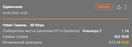 💡 Победа «Югры» с учетом овертайма и серии буллитов за 1.76