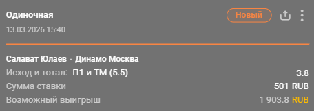 💡 «Салават Юлаев» не проиграет + тотал меньше (6.5) за 2.02