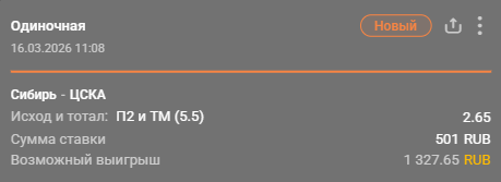 💡 ЦСКА не проиграет + тотал меньше (5.5) за 1.90