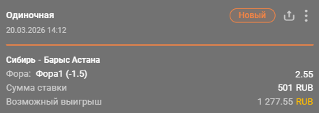 💡 Победа «Сибири» с форой (-1.5) за 2.53
