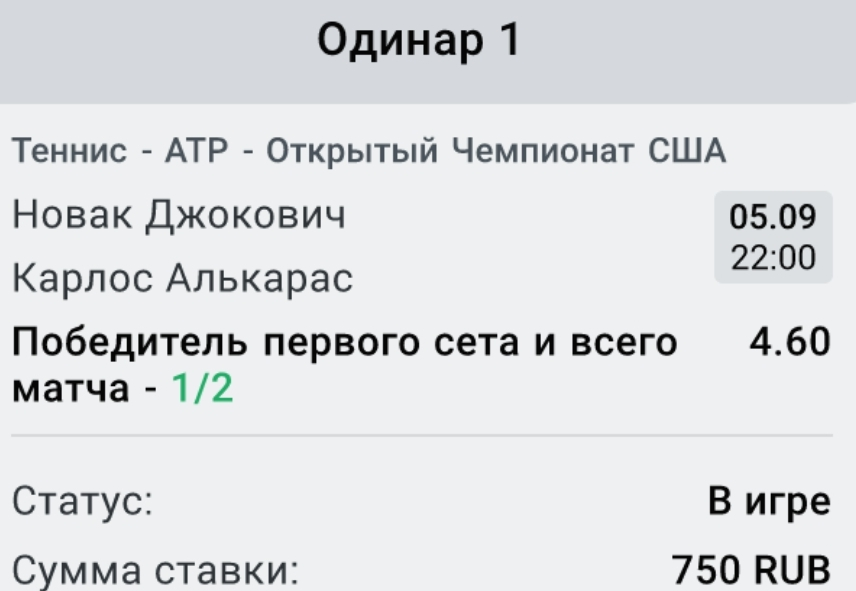 Сет / матч П1П2Ставка: 500Проигрыш: -500