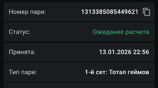 Тотал (10.5) Б. 1-й СетСтавка: 500Выигрыш: +1128 Результат: 0:2 (5:7 2:6)