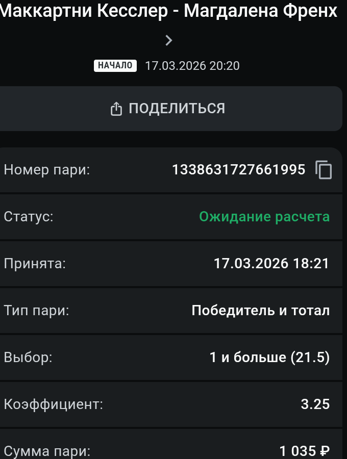 Говорящее, на самом деле, поражение... Указывающее, что на данном отрезке сезона Френх чувствует себя не очень уверенно. Несмотря на вышестоящее положение в рейтинге, будка не спешит назначать её фонарём. И я, пожалуй, готов с этим согласиться. Потенциально американка не слабее, а здесь ей было бы неплохо защитить очки за третий круг. В последние полтора месяца у неё появилась серийность, с которой и уверенности в собственных силах поприбавилось. Думаю, что дальше пройдёт именно МакКартни.